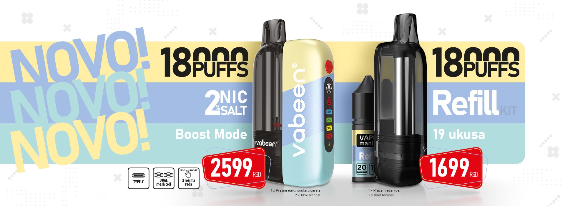 Vape Mania elektronska cigareta 18000 PUFFS je komplet koji se sastoji od punjivog uređaja, praznog rezervoara za e-tečnost sa grejačem i dve bočice e-tečnosti kapaciteta 10ml!